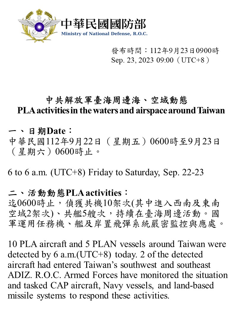 TAIPEI (Taiwan News) — Taiwan's Ministry of National Defense (MND) tracked 10 Chinese military aircraft and five naval vessels around the country between 6 a.m. Friday (Sept. 22) and 6 a.m. Saturday (Sept. 23).
