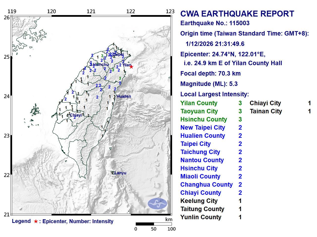 The quake registered a 3 in Yilan County, Taoyuan, and Hsinchu County. An intensity level of 2 was recorded in New Taipei, Hualien County, Taipei, Taichung, Nantou County, Hsinchu, Miaoli County, Changhua County, and Chiayi County.